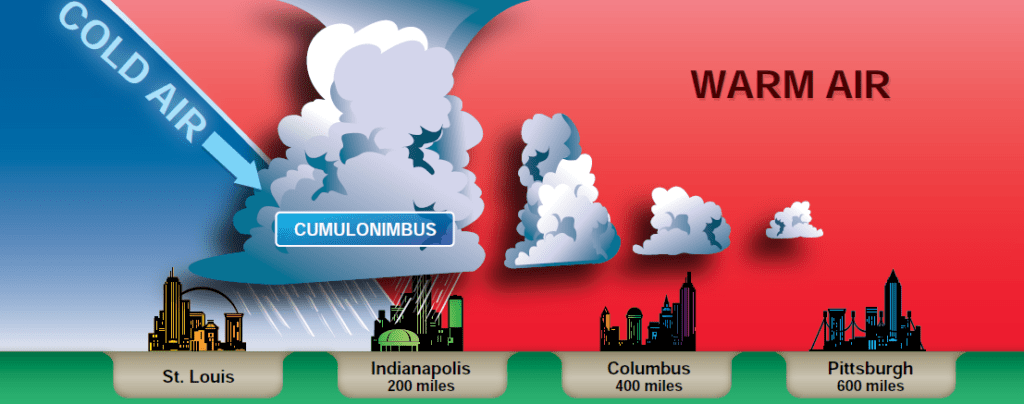 The danger doesn’t stop at the edge of the cloud, either. Severe turbulence can extend 20 miles or more away from an active cell. Hail can be thrown outward from the top of the storm. Gusty surface winds and rapidly shifting wind direction often precede a cell by several miles.