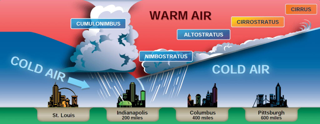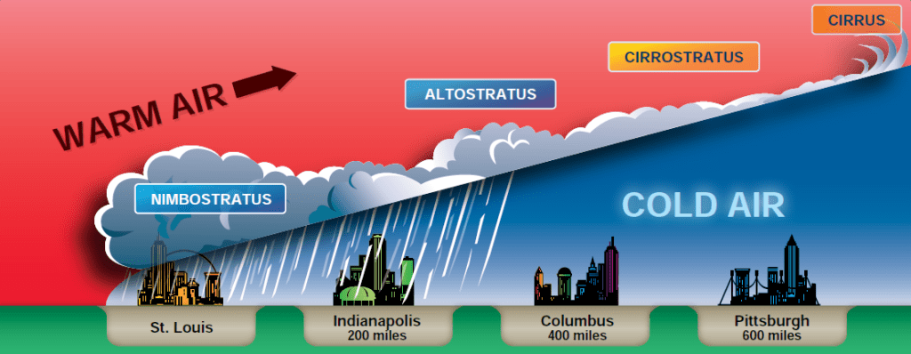 Warm fronts are the opposite scenario. A warm air mass advances and overrides retreating cold air. Because warm air rises gradually over a broad slope, the weather sequence develops slowly over hundreds of miles. Cirrus appears first, often a day or more before the front’s surface position arrives. Next come altostratus, then nimbostratus with steady precipitation. Warm front weather is less dramatic than cold front weather but can persist for much longer and produce low ceilings and poor visibility over a wide area.
